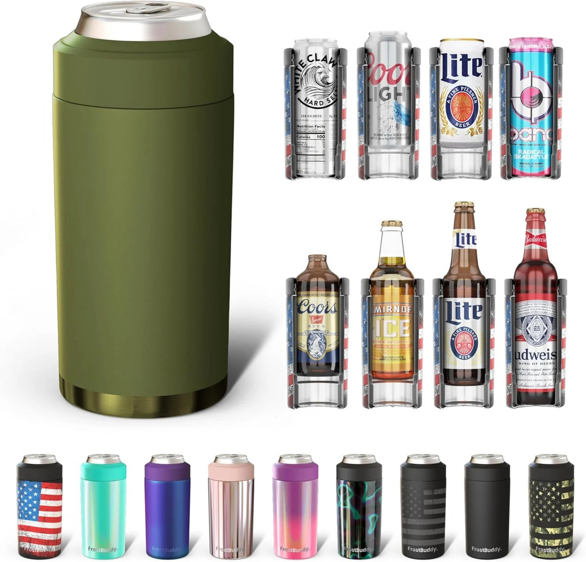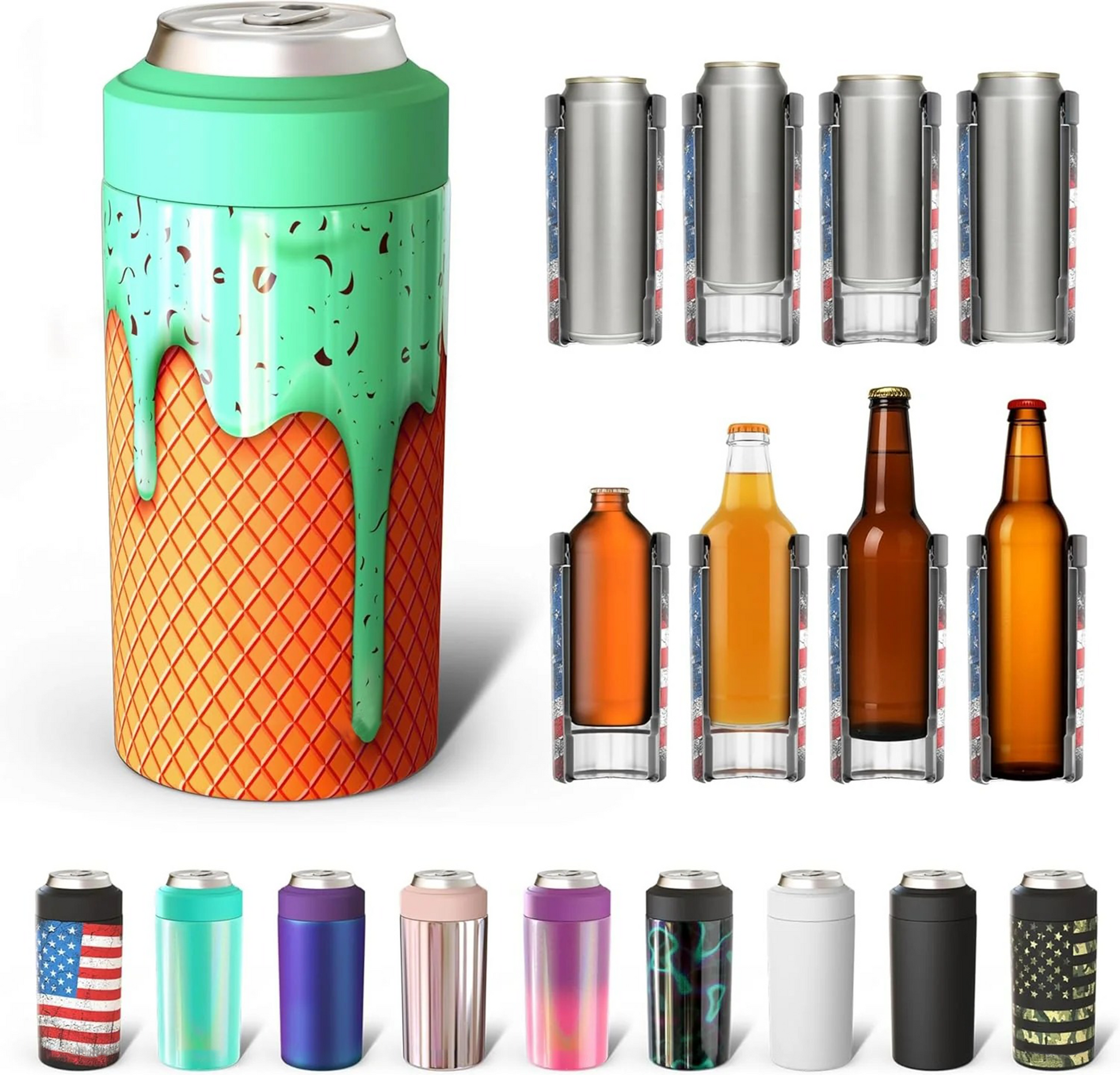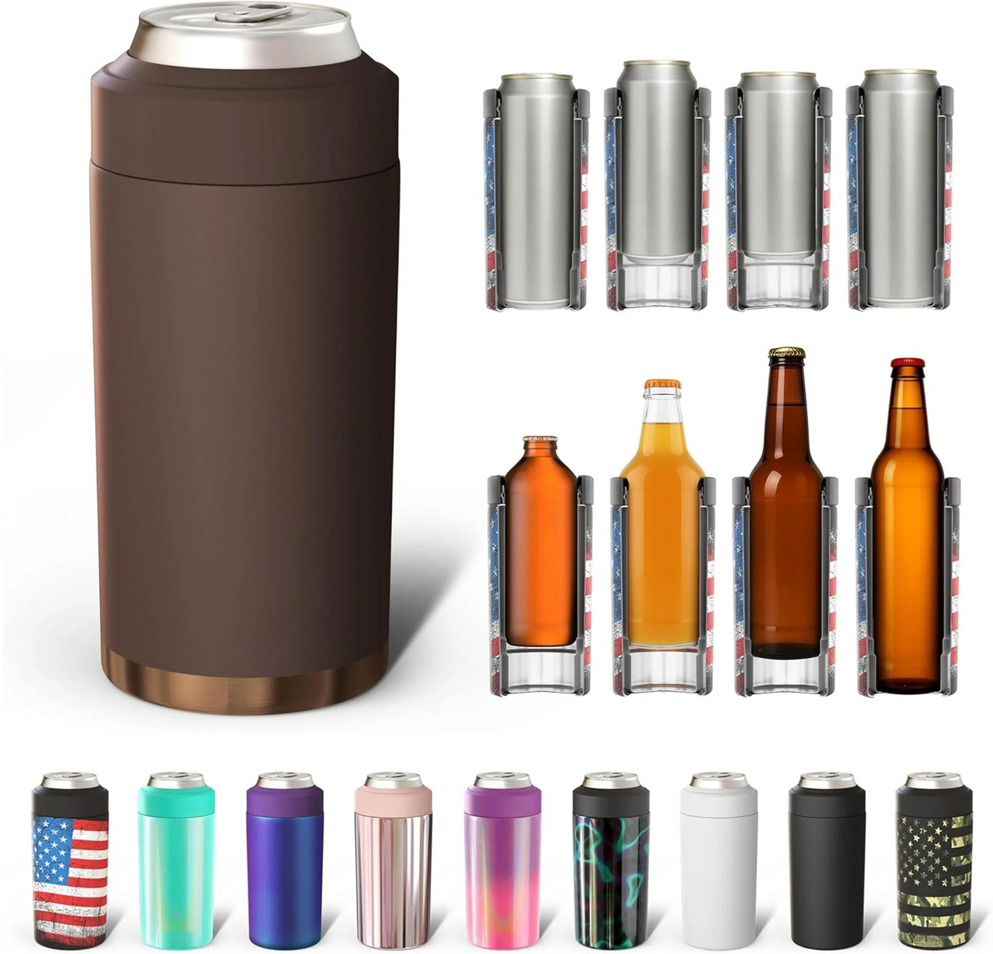 - FIVE SIZES IN ONE: This is the ONLY Universal can insulated cooler for you! The perfect can keeper for your cans. slim cans. and bottles. Finally! No more switching coolers! Drink whatever size of drink you want! This can cooler fits your favorite 12oz cans and slim cans. 16oz cans and bottles all in one.